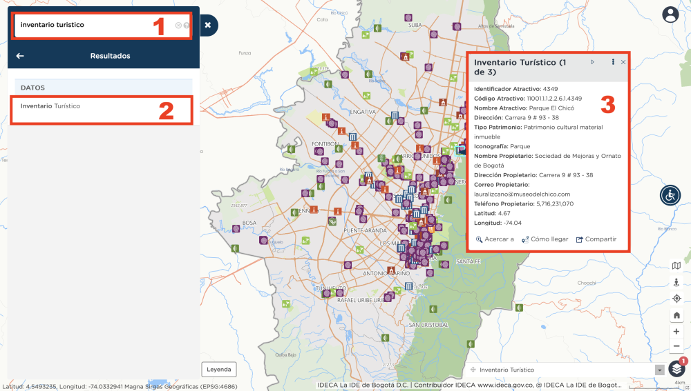 - Ingresa a Mapas Bogotá - https://mapas.bogota.gov.co y escribe la palabra clave en el buscador, en este caso es “turístico”.
