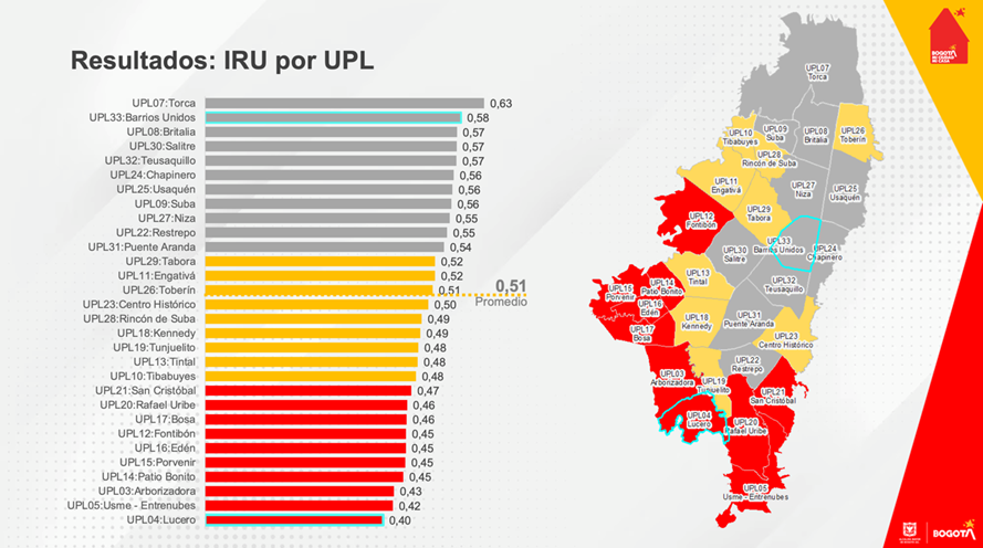Los resultados preliminares del cálculo Índice de Revitalización Urbana para el año 2023 muestran que, en promedio, para las Unidades de Planeamiento Local (UPL) es de 0,51, siendo una medida intermedia si se tiene en cuenta que entre más cerca está de 1 mejores condiciones territoriales presenta. En los tres ejes del IRU se obtuvo un promedio para la ciudad de 0,46 en el eje de hábitat, 0,44 en el eje de funcionalidad y 0,62 en el eje de sostenibilidad y resiliencia.